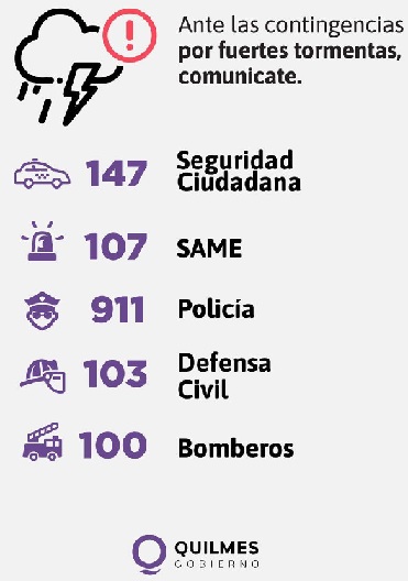 En caso de emergencias, el Municipio recordó los números de contacto disponibles: 147 para Seguridad Ciudadana, 107 para el SAME, 911 para la Policía, 103 para Defensa Civil y 100 para Bomberos.