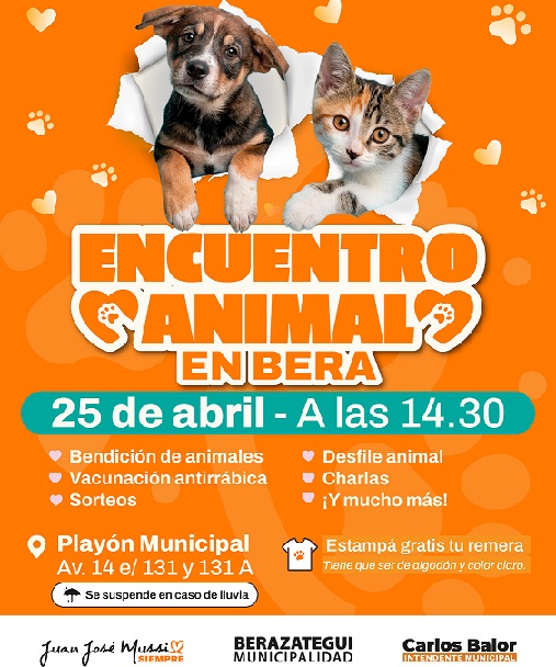 El sábado 25 de abril, desde las 14.30, el playón del Edificio Municipal (Av. 14 y 131 A) será escenario de una nueva edición del tradicional Encuentro Animal de Berazategui, una propuesta pensada para disfrutar en familia y junto a los animales de compañía en su día. La actividad, con entrada libre y gratuita, es organizada por la Municipalidad e impulsada por el intendente Carlos Balor.