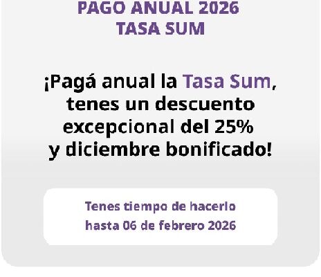 EL MUNICIPIO PRORROGA HASTA EL 6 DE FEBRERO EL PAGO ANUAL DE LA TASA SUM 2026 Y OBTENER UN DESCUENTO DEL 25% CON DICIEMBRE BONIFICADO