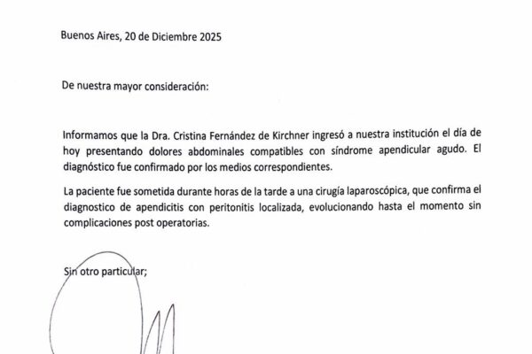 El primer parte médico emitido por la Directora Médica Dra. Marisa Lanfranconi informa que: La Dra. Cristina Fernández de Kirchner ingresó a nuestra Institución el día de hoy (20.12.2025), presentando dolores abdominales compatibles con síndrome apendicular agudo. El diagnóstico fue confirmado por los médicos correspondientes. La paciente fue sometida en horas de la tarde a…
