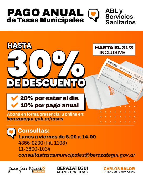 Recibí hasta un 30% de descuento por el pago anual de tus tasas municipales. Podes abonar de manera presencial o virtual, ingresando en http://berazategui.gob.ar/tasas