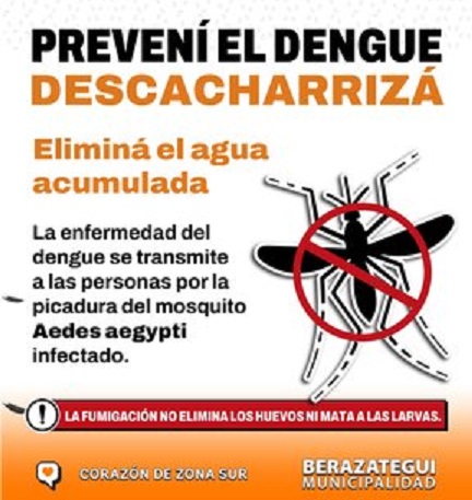 ¡Descacharrizá! Eliminá recipientes con agua estancada, que es donde se reproduce este insecto. ¡Prevenir está en tus manos! +Info en http://berazategui.gob.ar/dengue