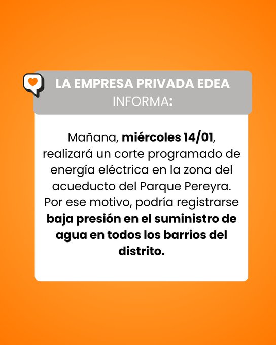 La empresa privada EDEA informó que mañana, miércoles 14/01, realizará un corte programado de energía eléctrica en la zona del acueducto del Parque Pereyra. Por ese motivo, podría registrarse baja presión en el suministro de agua en todos los barrios del distrito.